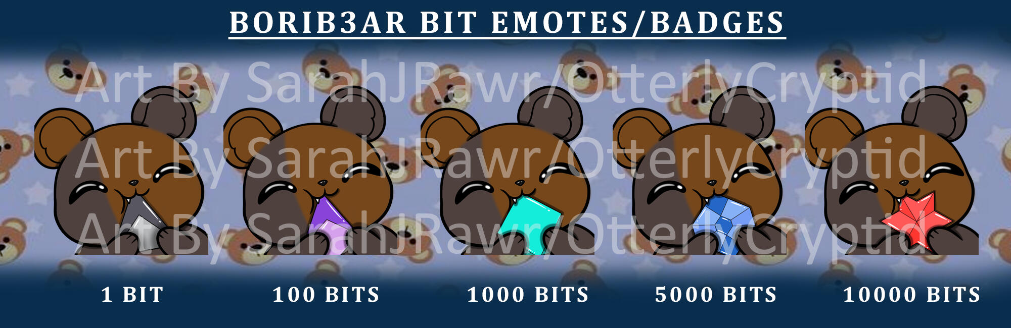 | Bit Badges | Size 900x000 (Reszied for Emotes) | 11$ USD per emote 45$ for pack of 10 | +5$ complex fee |